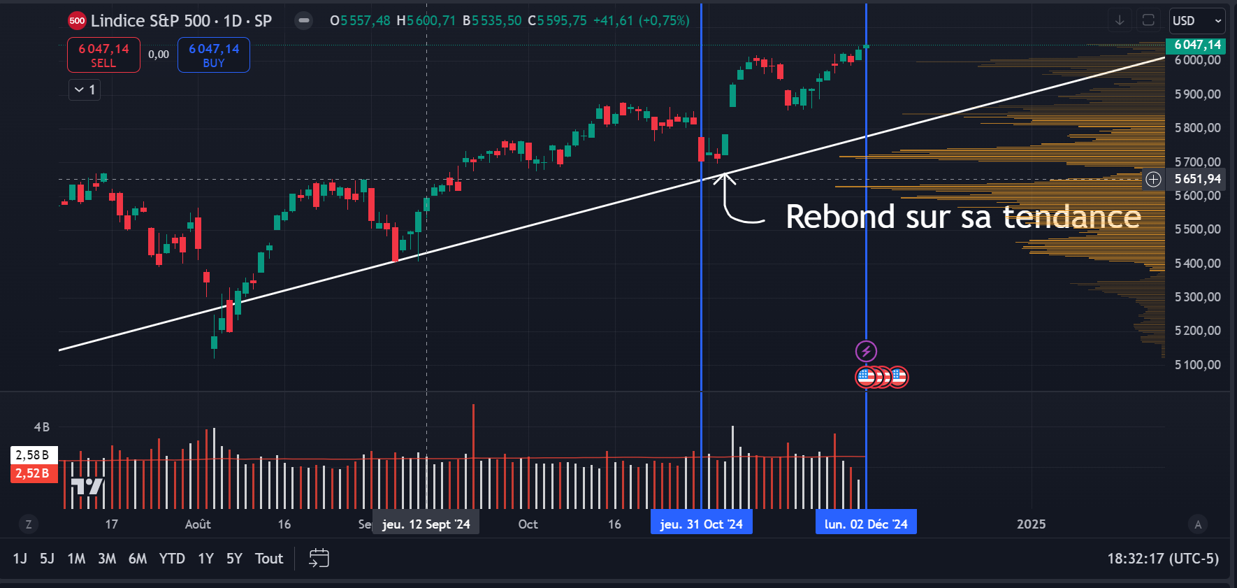 Le SP500 est venu rebondir sur sa ligne de tendance haussière (la ligne que l’on peut observer sur les graphiques). Le sp500 suit cette ligne de tendance haussière depuis environs octobre 2023. De plus, le SP500 est de nouveau en haut historique, donc il a atteint un niveau jamais vu auparavant. Sinon au niveau de l’économie, l’inflation est toujours plus élevée par rapport aux attentes de la banque centrale américaine. De plus, les investisseurs craignent la possible politique monétaire inflationniste de Trump. Malgré cette préoccupation, les marchés américains ont quand même montés car certain aspect de la politique monétaire de Trump serait favorable pour les entreprises américaines. Somme toute, le SP500 continu à monter vers le haut.