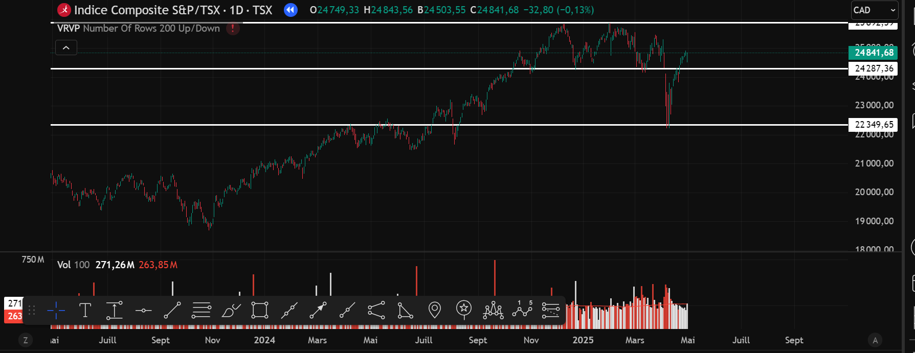 Du côté canadien, la Bourse de Toronto a récemment franchi un seuil de résistance technique, ce qui suggère une dynamique haussière vers de nouveaux sommets. Plus précisément, l’indice avait buté à plusieurs reprises autour de la zone des 25 892 points, correspondant à son ancien sommet historique.