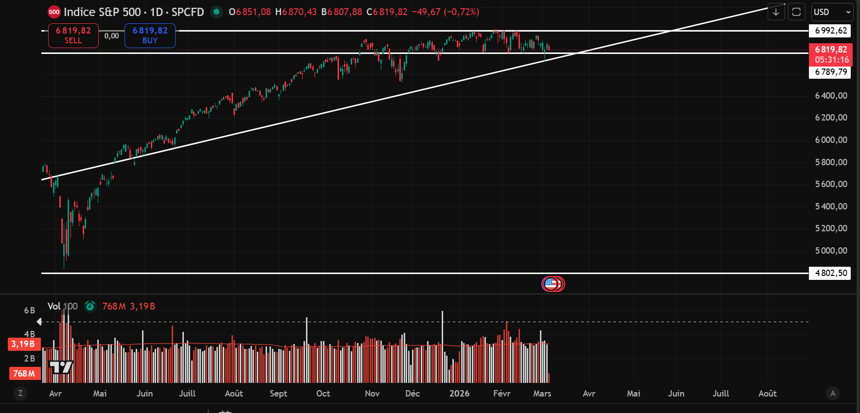 Le S&P 500 continue d’évoluer de façon relativement latérale, soit entre sa ligne de support (ligne blanche inférieure) et sa ligne de résistance (ligne blanche supérieure). Autrement dit, l’indice se déplace dans une zone relativement stable depuis quelque temps.